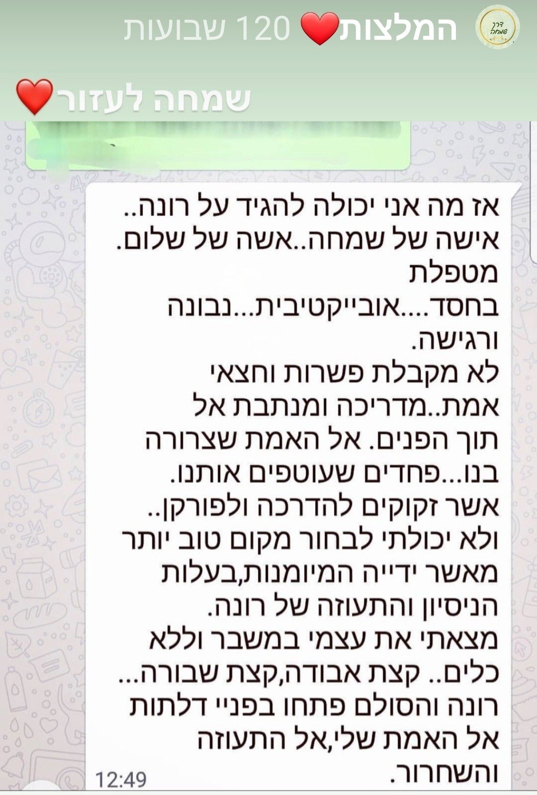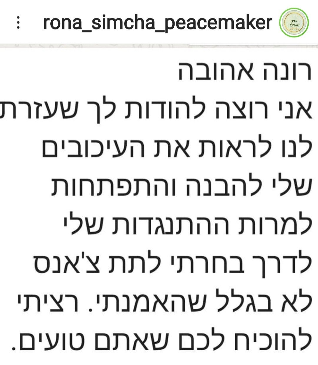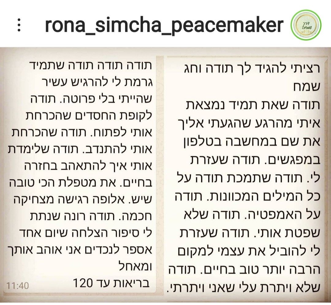 דרך שמחה נוסדה מתוך אמונה עמוקה בכוחה של הרוח האנושית להתגבר, להתרפא ולפרוח – גם מתוך המקומות החשוכים ביותר. רונה, מטפלת רגשית מנוסה עם מעל ל־18 שנות ניסיון, מלווה אנשים במסע ריפוי רגשי עמוק, בגישה ייחודית של פסיכותרפיה ייעודית. הגישה מבוססת על אמונה טוטאלית באדם – מתוך ידיעה שכל מי שנכנס לתהליך, יוצא ממנו עם תוצאה – עם דרך חדשה.