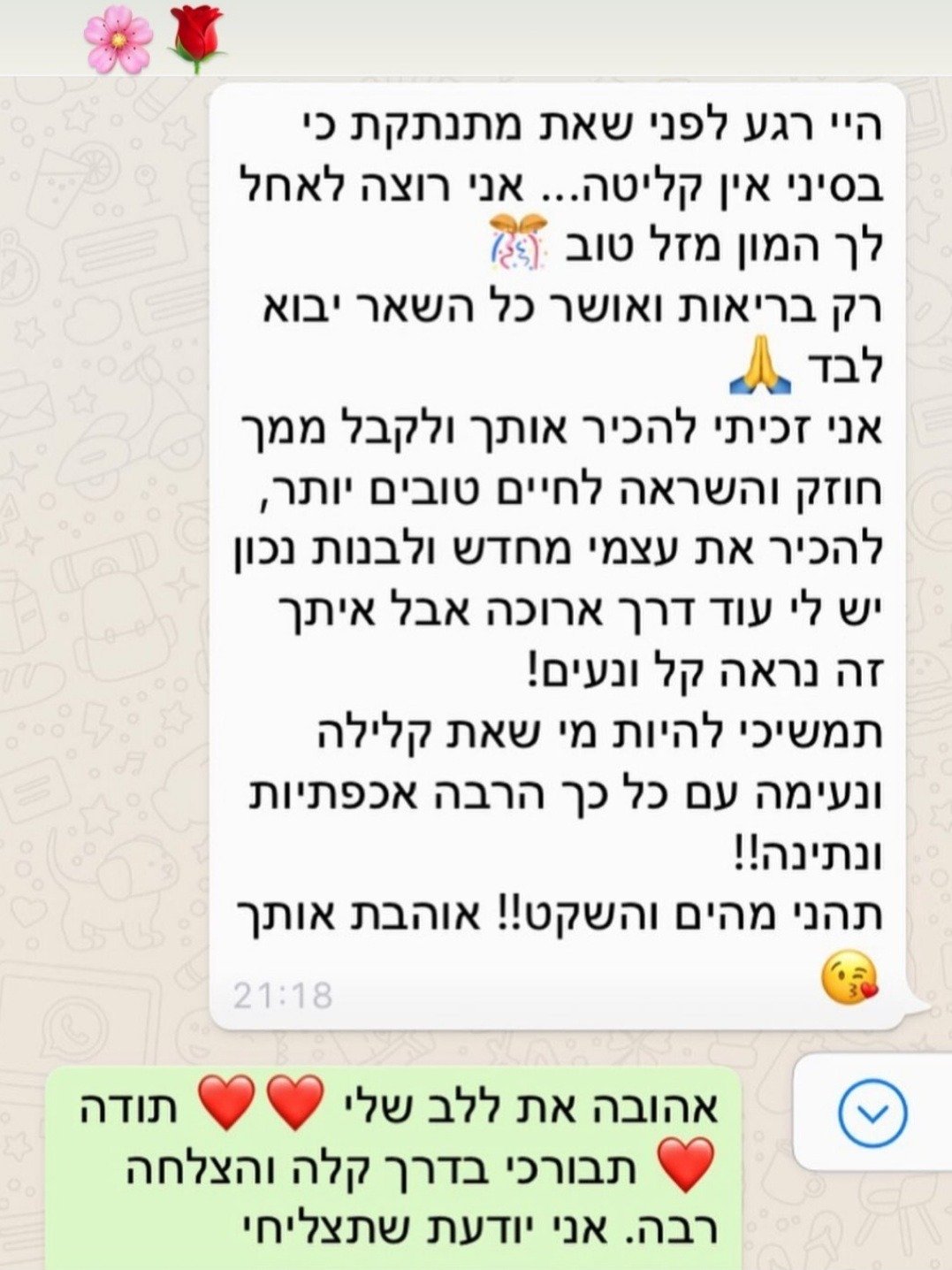במהלך מפגשים קבועים, נבנית מערכת אמון שמובילה לצמיחה, חיבור מחדש לערך העצמי, חיזוק הכוחות הפנימיים, ולעיתים – גם ליצירת חלומות חדשים ופתיחת דלתות של תקווה.