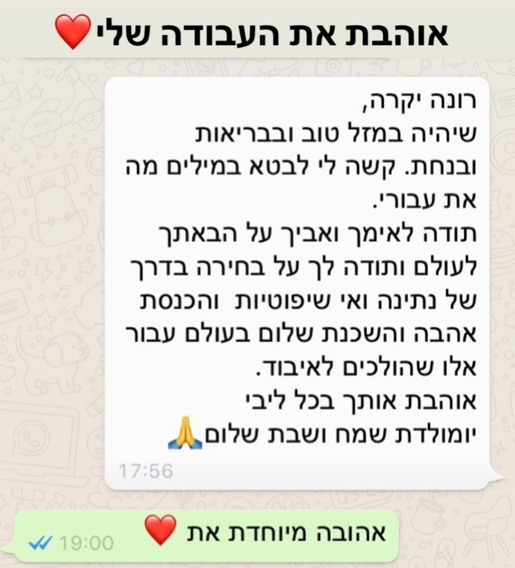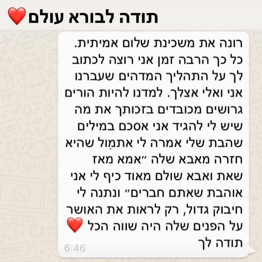 בתהליך ייחודי ורגיש, רונה פוגשת אותך בדיוק במקום שבו את/ה נמצא/ת – מבלי לשפוט, עם הרבה אהבה, נוכחות עמוקה וכלים מעשיים.